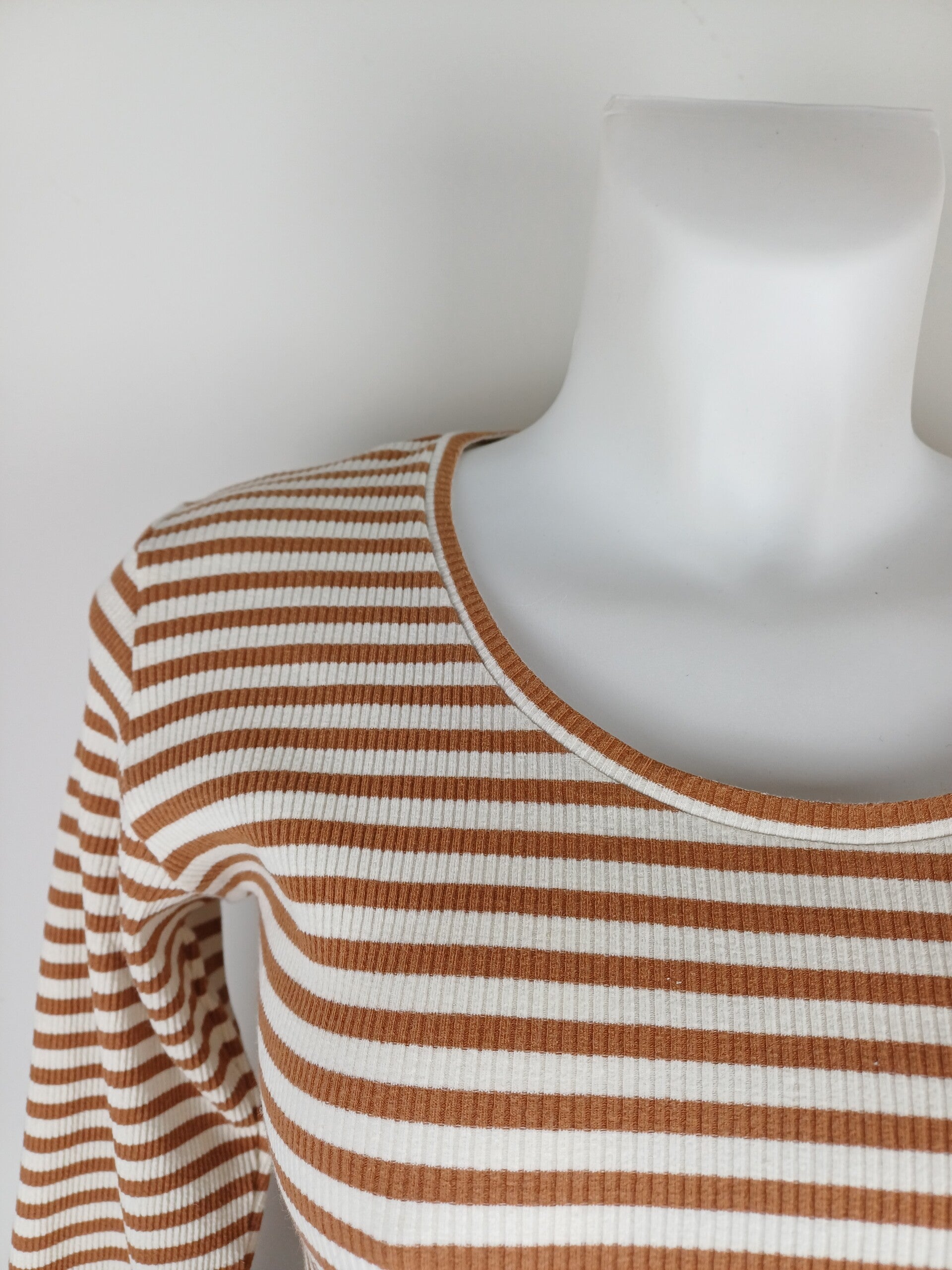 Dit heerlijke bruin/ecru kleurig gestreepte positieshirt is een echte musthave voor in jouw kast!